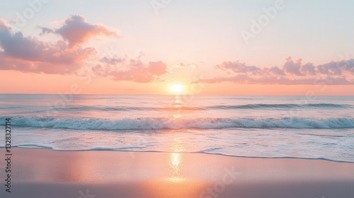 spring sunset over a calm beach, with the sky painted in shades of pink and orange as gentle waves roll in