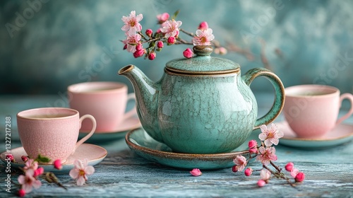 Spring tea set on wooden table with flowers
