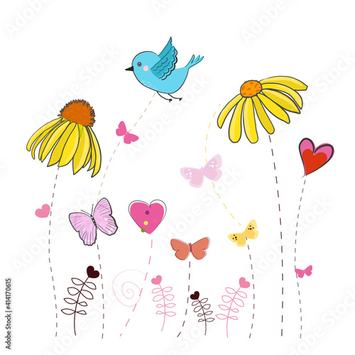 Spring time decorative yellow flower illustration with blue cute bird and butterfly spring background greeting card