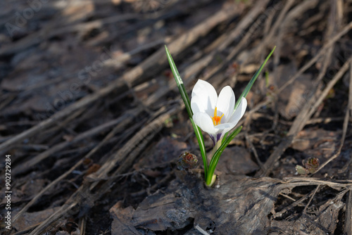 Spring white flowers Crocus Jeanne d'Arc macro. Beautiful petals and stamens close-up.