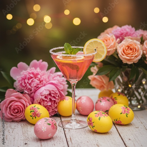Springtime Cocktail with Floral Eggs and Lemon Decor on Rustic Table