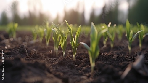Springtime corn field with fresh green sprouts. Generative AI