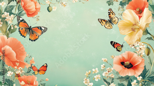 Springtime holidays brochure template. Spring floral frame of poppy and jasmine flowers with ribbon banner, butterfly and green leaves. Flower wreath with greetings for spring season holidays design.
