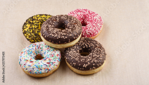 Sprinkled confetti with baked donuts with different icing. Wrapping paper