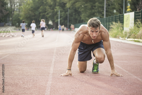 Sprinter at start position, kneeling, muscular body.