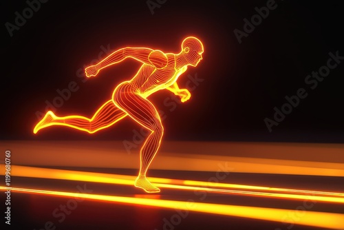 Sprinter on a holographic track, showing muscle engagement and biomechanics in real-time, neon highlights, high detail. , closes up