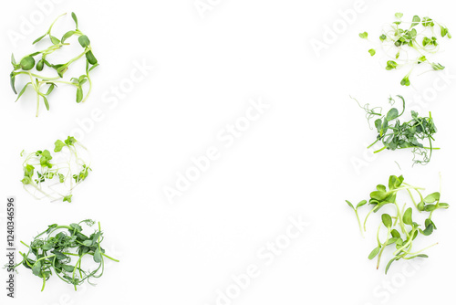 Sprouting microgreens at home. Heaps of germinated microgreens pea, top view. Vegan and healthy eating.