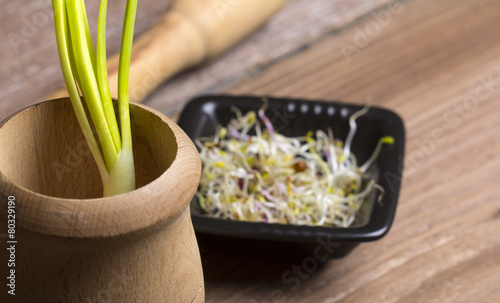 Sprouts and green vegetables on wooden table