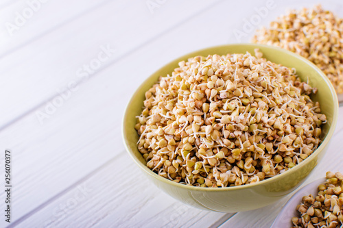 Sprouts of green buckwheat in a bowl. Macro shot. Raw buckwheat.