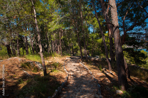 Spruce forest, with paved stone paths. Alanya, Turkey