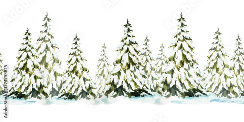 Spruce tree snow covered seamless border. Snowy winter Christmas fir. Hand drawn watercolor illustration isolated pattern from background. Clipart for holiday fabric, Xmas wallpaper, packaging design.
