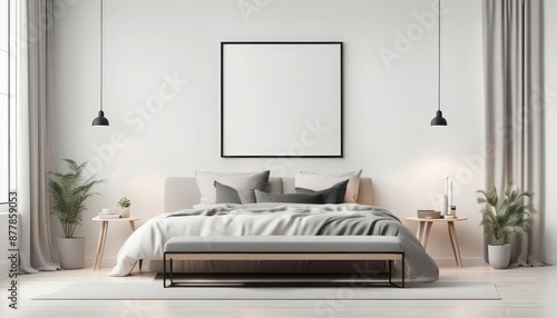 Square blank picture frame mockup on a white wall. Modern bedroom