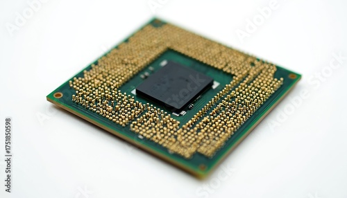Square computer central processing unit detailed macro view. Gold pins surround black silicon chip on green circuit board. Isolated tech hardware component for computing.