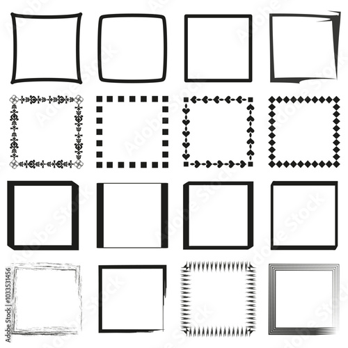Square frame set. Decorative border design. Black outline shapes. Ornamental vector borders