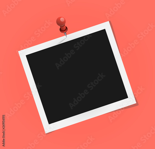 Square frame template on plastic pin with shadows isolated. Living coral - color of 2019 year. Memories concept in modern style. Vector illustration