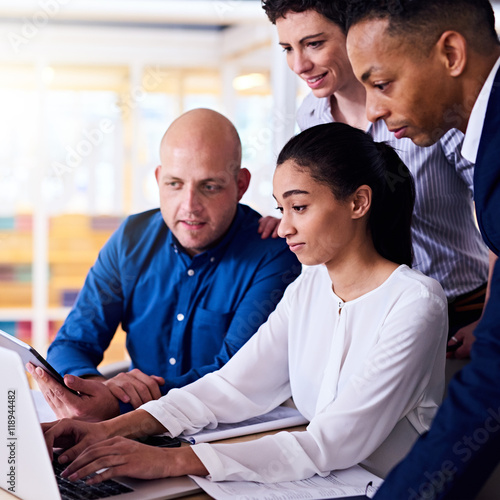 Square image of four multiethnic diverse business people all with their own fresh perspective on the information that everyone is looking at on the laptop computer and electronic tablet.