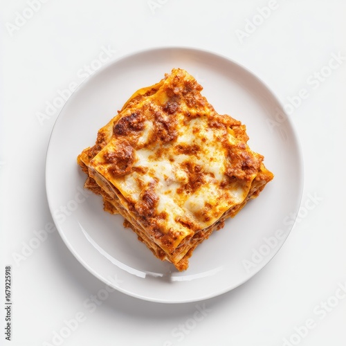 Square lasagna dish on white plate
