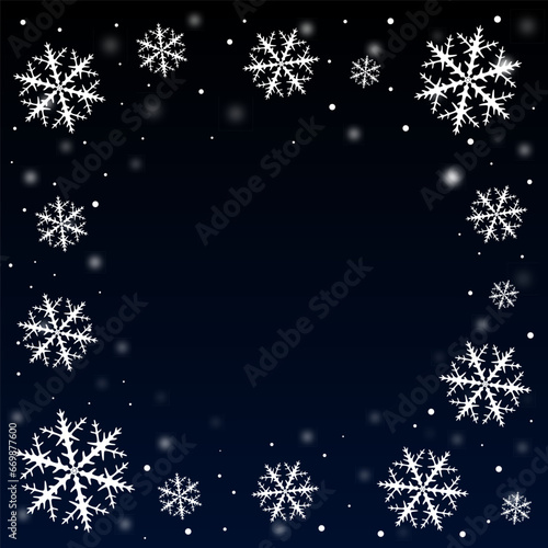 Square postcard with frame of snowflakes and falling snow, with empty space in middle for text
