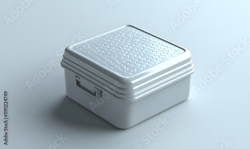 Square white plastic storage container with textured lid and handle.