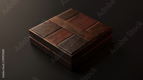 Square wooden box with leather accents, dark background.