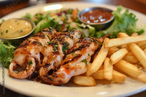 Squid cooked on a grill accompanied by fries and salad on a white dish in a dining environment