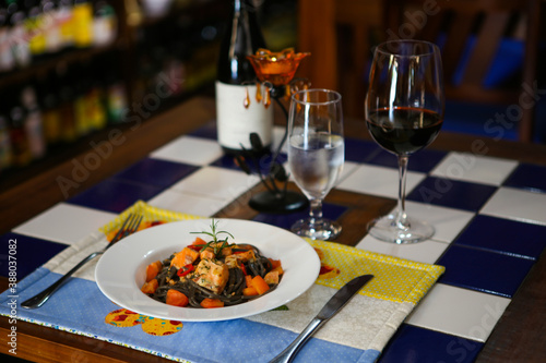 Squid ink pasta with salmon and wine in an italian restaurant