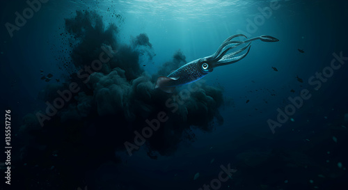 Squid Swimming Near Dark Cloud in Blue Ocean Water