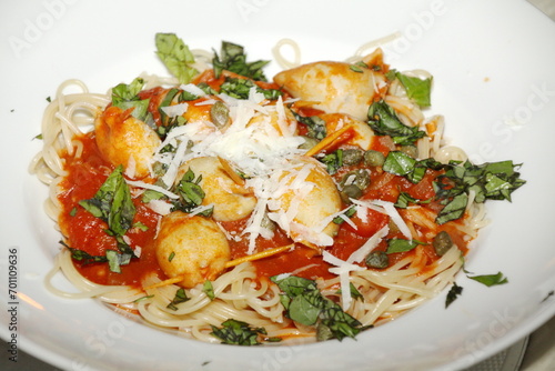 Squid tubes stuffed with pecorino, breadcrumbs, capers, pasta, tomato sauce, basil, garlic, parsley, Italian dish,