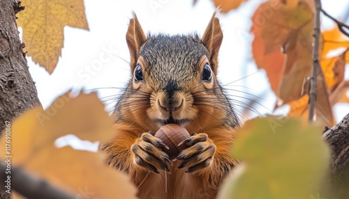 Squirrel eating acorn, autumn leaves, tree, park, nature