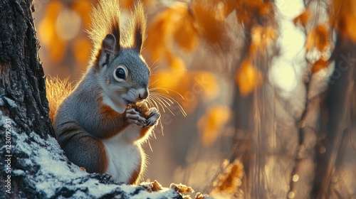 Squirrel Eating Nut on Tree with Autumn Leaves in Soft Light