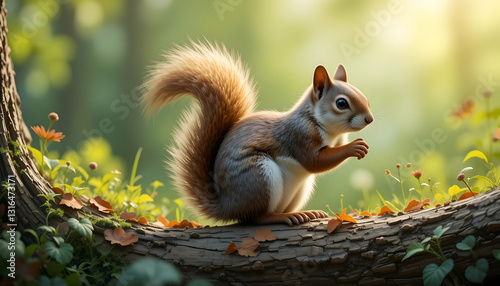 Squirrel Eating on Log in Forest with Greenery and Sunlight