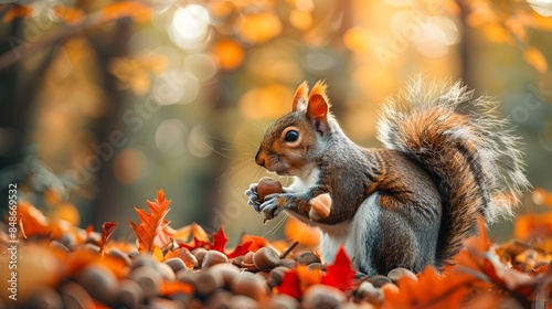 Squirrel Foraging for Acorns in Vibrant Autumn Forest Landscape