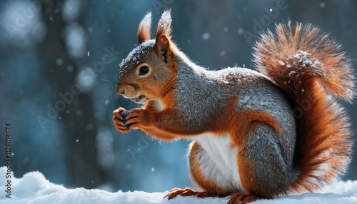 Squirrel foraging for food in a snowy forest during winter season