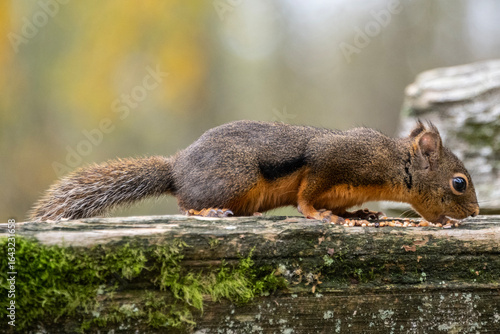 Squirrel foraging near a wooden log in a serene forest setting during autumn