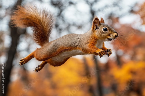 Squirrel leaps through autumn foliage in vibrant forest during sunny afternoon