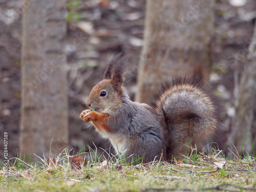 Squirrel looking for food in spring: nature of Northern Europe, Finland, April.