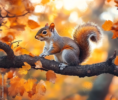 Squirrel on Oak Branch in Autumn, National Geographic Style, AI generated illustration