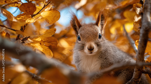 Squirrel resting among vibrant autumn leaves, showcasing a natural habitat filled with golden colors and the beauty of seasonal foliage against a clear blue sky.