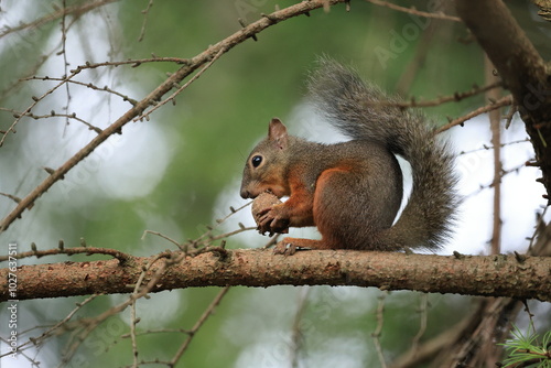 Squirrel sitting on a tree branch eating a nut in the forest in Japan