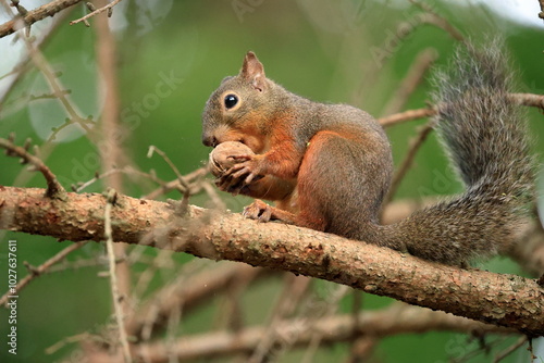 Squirrel sitting on a tree branch eating a nut in the forest in Japan