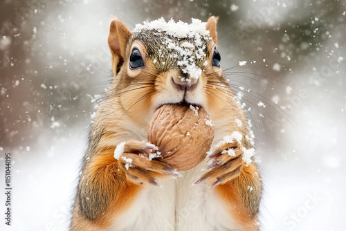 Squirrel with a nut in its mouth, frozen mid-bite with a surprised expression