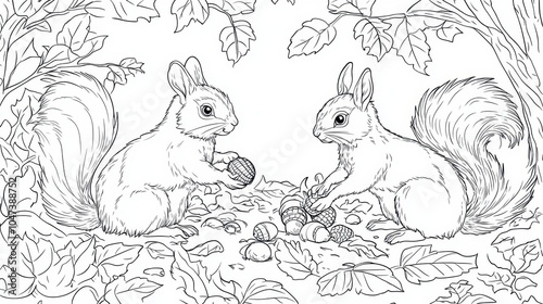 Squirrels gather acorns in a forest clearing, surrounded by foliage on a sunny afternoon, coloring page