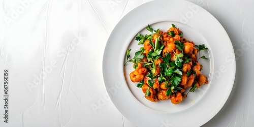 Sri Lankan Ambul Thiyal dish on white plate topdown view on white. Concept Sri Lankan Cuisine, Ambul Thiyal Dish, Food Photography, Top-Down View, White Plate