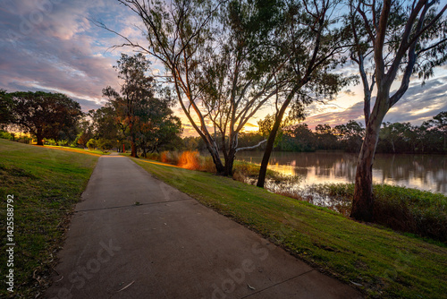 St George, QLD, Australia - Park and walking path along the Balonne River at sunset