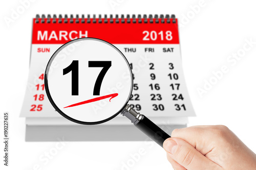 St. Patrick Day Concept. 17 march 2018 calendar with magnifier