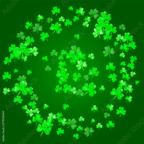 St patricks day background with shamrock. Lucky trefoil confetti. Glitter frame of clover leaves. Template for voucher, special business ad, banner. Decorative st patricks day backdrop.