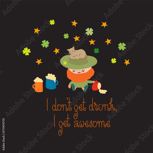 St. Patrick's Day illustration with Leprechaun and handwritten text I dont get drunk, I get awesome.