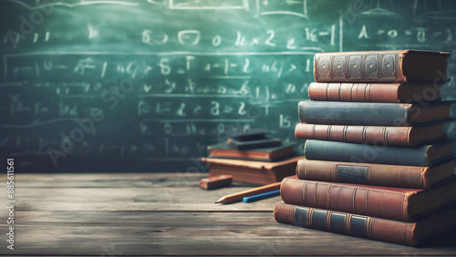 Stack of aged vintage books with worn covers on a rustic wooden table, blurred chalkboard with mathematical scribbles, academic activities free space for text