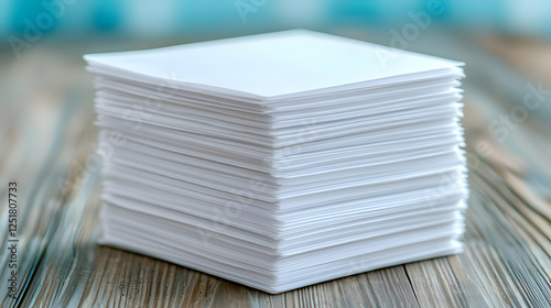 Stack of blank paper on wooden table, blurred background. Office supply