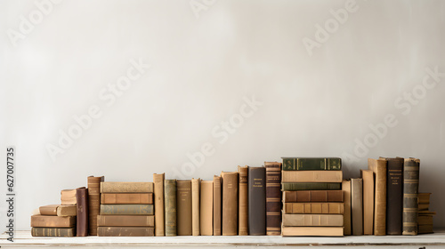 Stack of books against white wall background, vintage old cover books on deck table with copy space